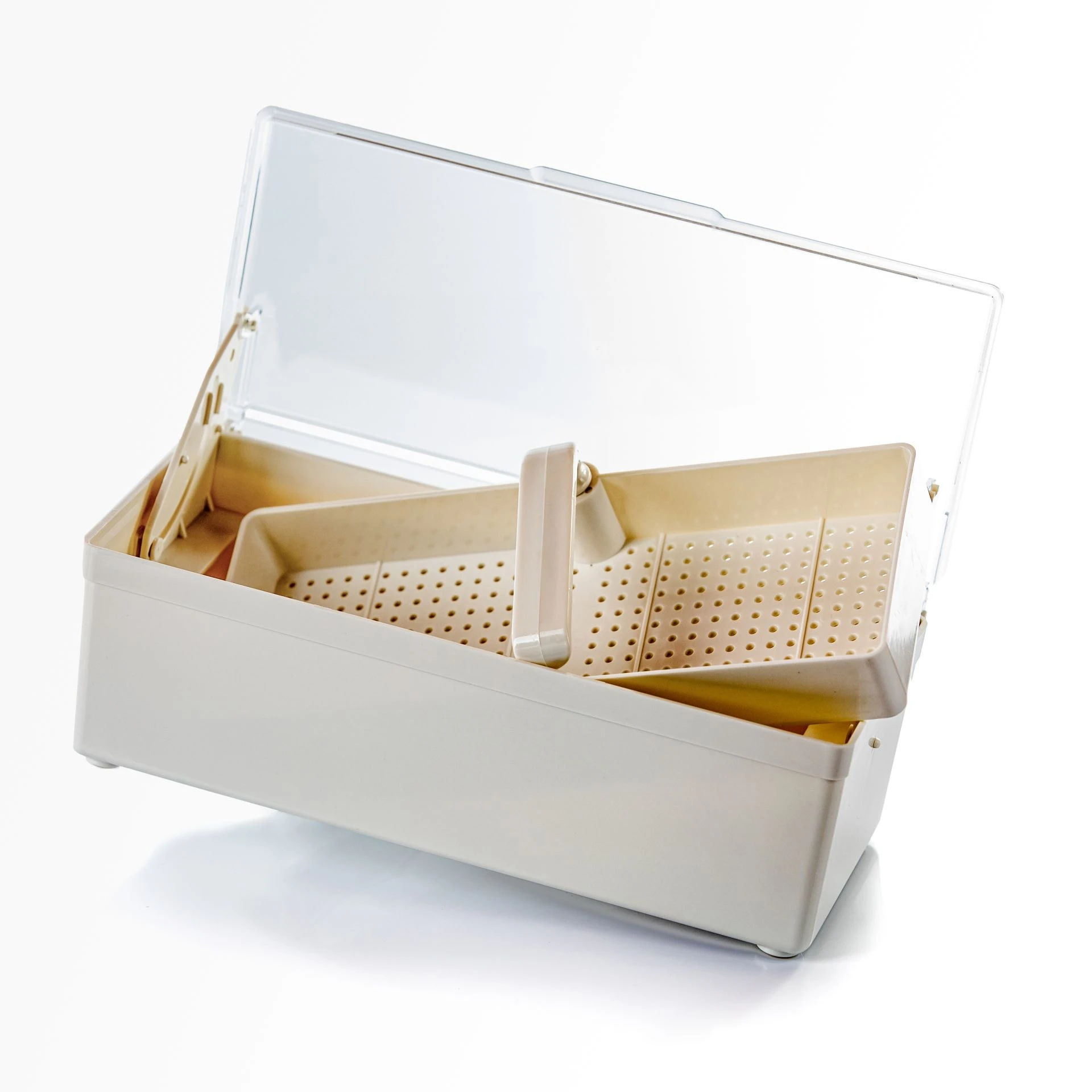 Na het reinigen van uw instrumenten in de ultrasoon legt u de instrumenten nog een poosje in de Alcohol 70% in de desinfectie tray. Na een aantal minuten klapt u de tray open en laat u de instrumenten aan de lucht drogen.